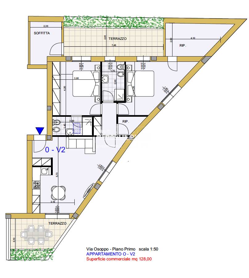 Immobile così disposto: ingresso, soggiorno con cucina a vista e sbocco su terrazzo, dis.,due bagni, due camere da letto matrimoniali con accesso al secondo e ampio terrazzo, due ripostigli/cabine armadi e un solaio.