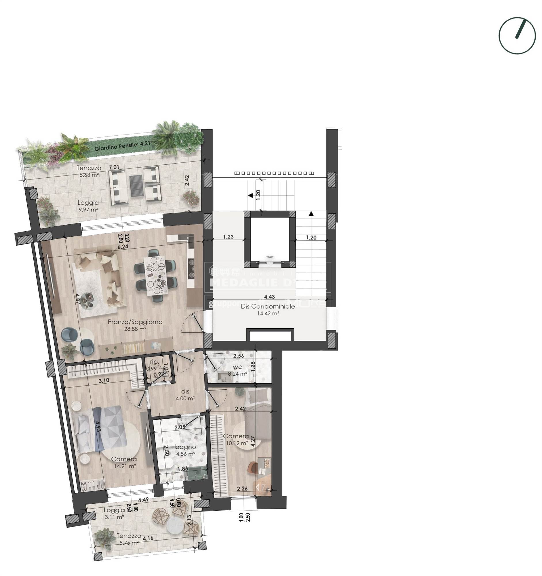 MO867D_B5 Nostra esclusiva, Via del Mercato, all'interno del nuovo comparto Ex Mercato Bestiame, nuova realizzazione di palazzina (Classe Energetica A4-NZEB) vendesi attico "B5" al piano terzo ed ultimo con ascensore, di 99 mq., due logge coperte e giardino pensile.