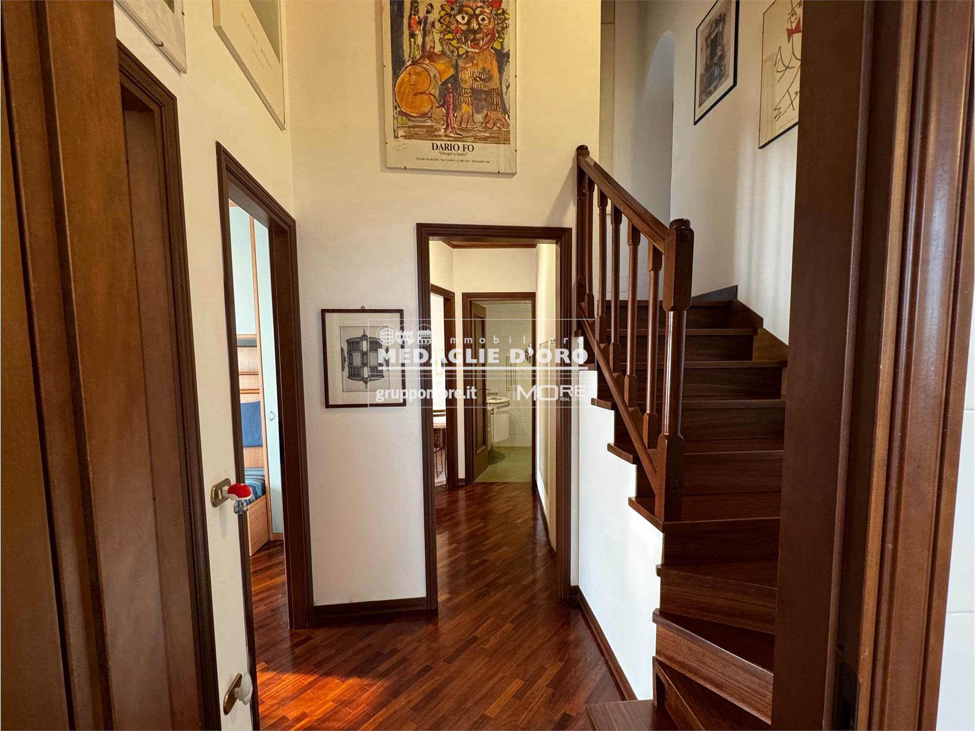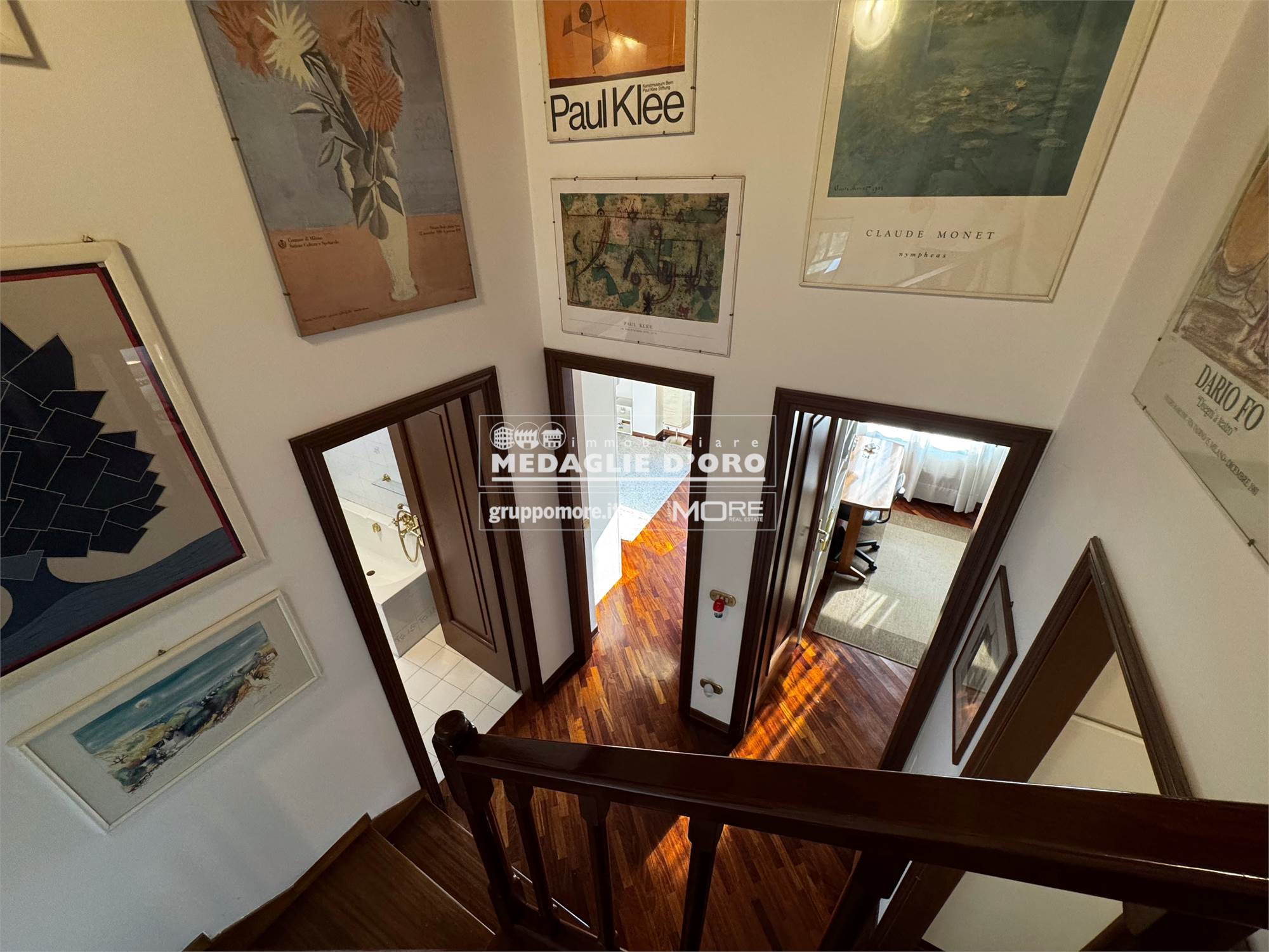 Ingresso, salone con camino, sala da pranzo, cucina abitabile, terrazzo, tre camere, due bagni, soppalco con studio-camera, lavanderia (possibile terzo bagno), ripostiglio, balcone. Molto luminoso e libero su tutti i 4 lati con totale privacy e perfetta esposizione.