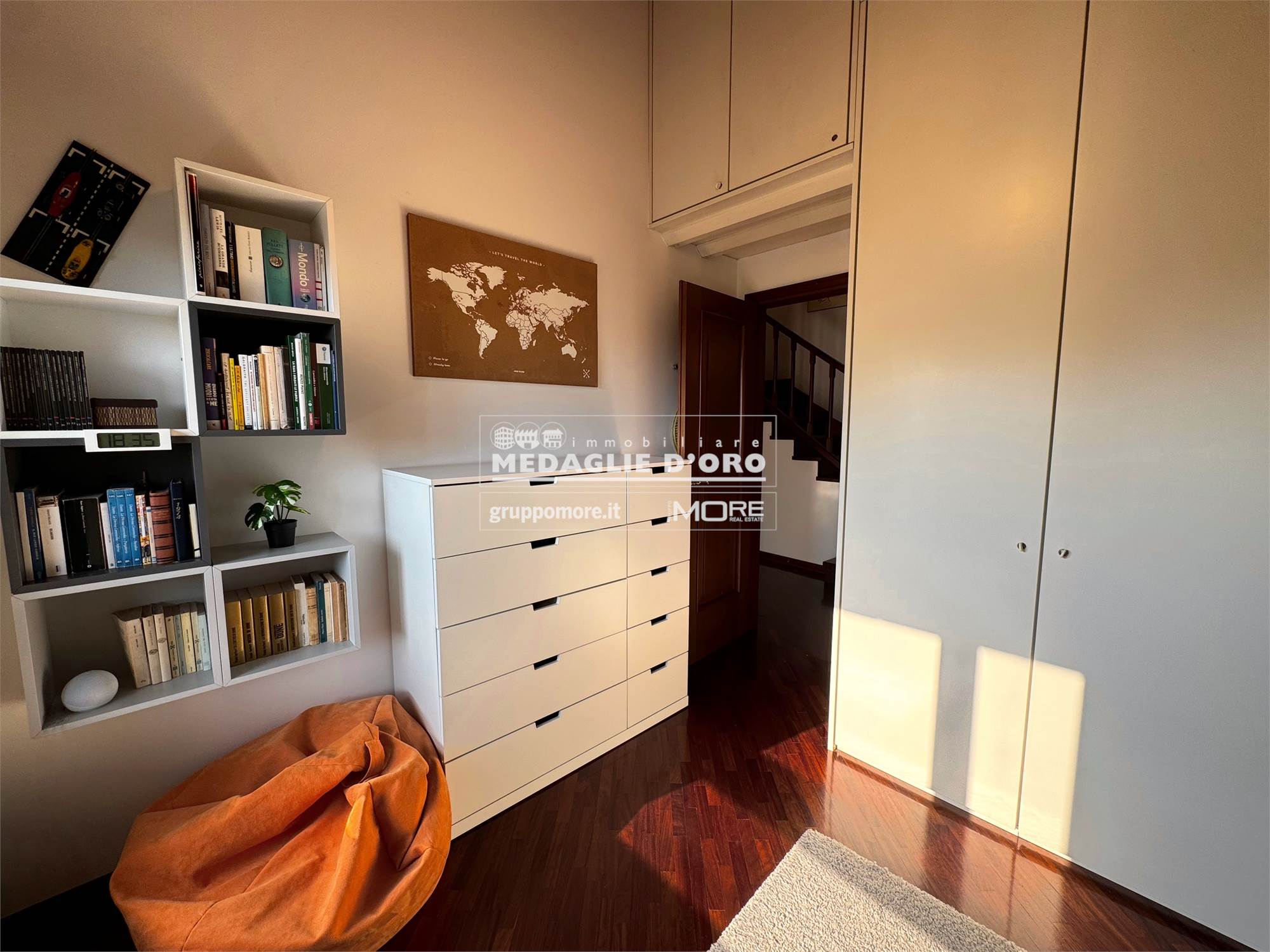 Ingresso, salone con camino, sala da pranzo, cucina abitabile, terrazzo, tre camere, due bagni, soppalco con studio-camera, lavanderia (possibile terzo bagno), ripostiglio, balcone. Molto luminoso e libero su tutti i 4 lati con totale privacy e perfetta esposizione.